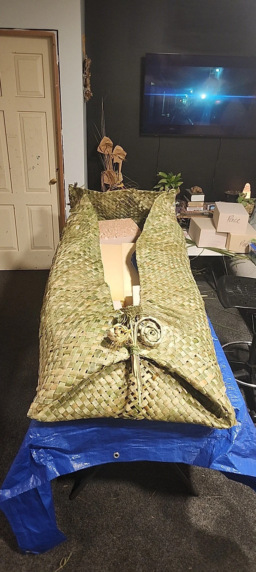 “Ka moe, ka mate, i roto i te aroha o te Atua. ko te waka tūpāpaku hei tiaki te whānau”